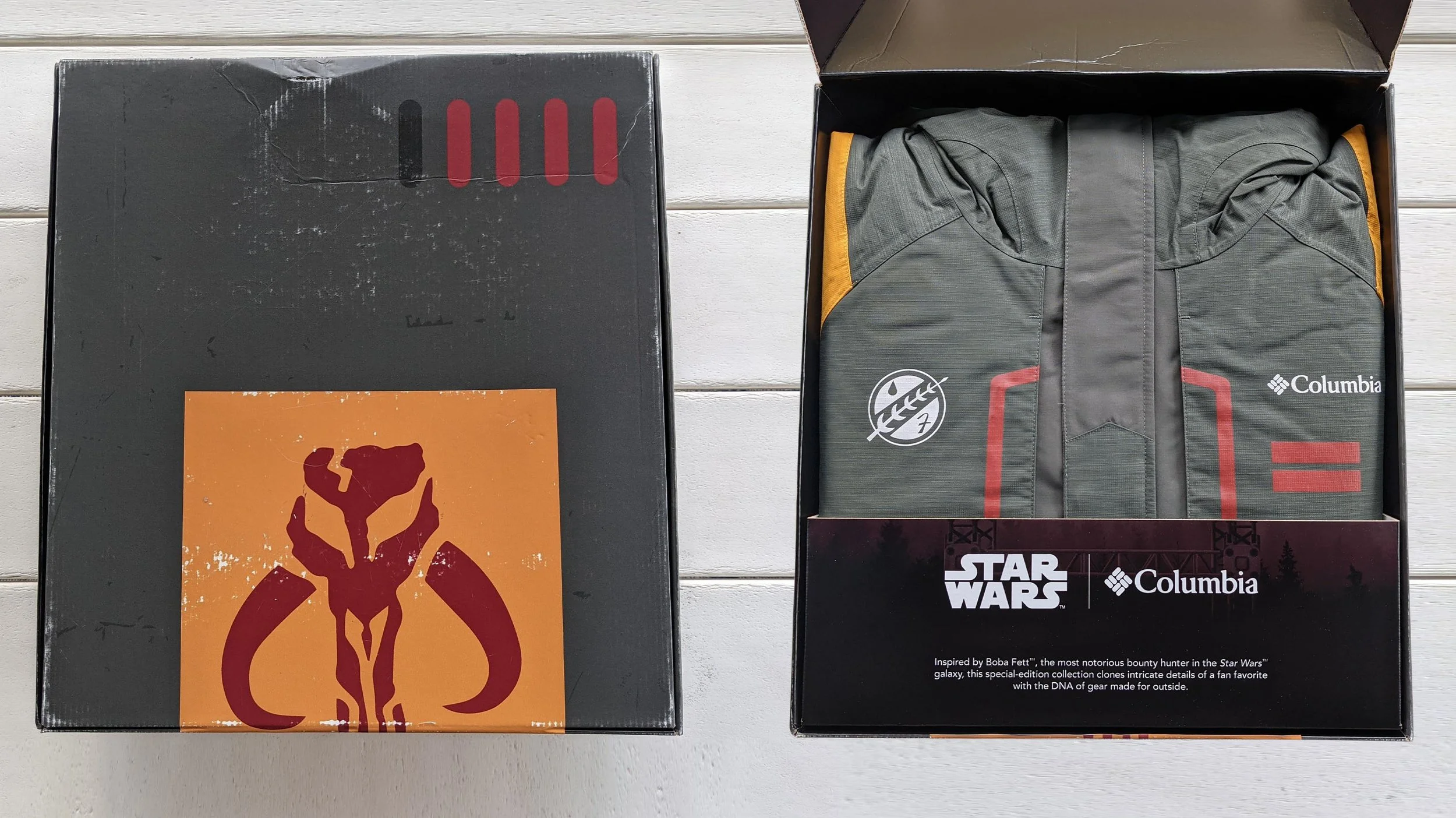The Boba Fett Collection is a four-piece outerwear and accessories line including a ball cap, a cotton-blend graphic tee, a heavyweight fleece hoodie and the three-in-one Interchange jacket. Everything in the collection features design touches pulled from Boba Fett’s armor — think jetpack exhaust port-like vents on the jacket back’s interior, the Mythosaur skull emblem, helmet dash markings and the mysterious symbol passed down from Jango.